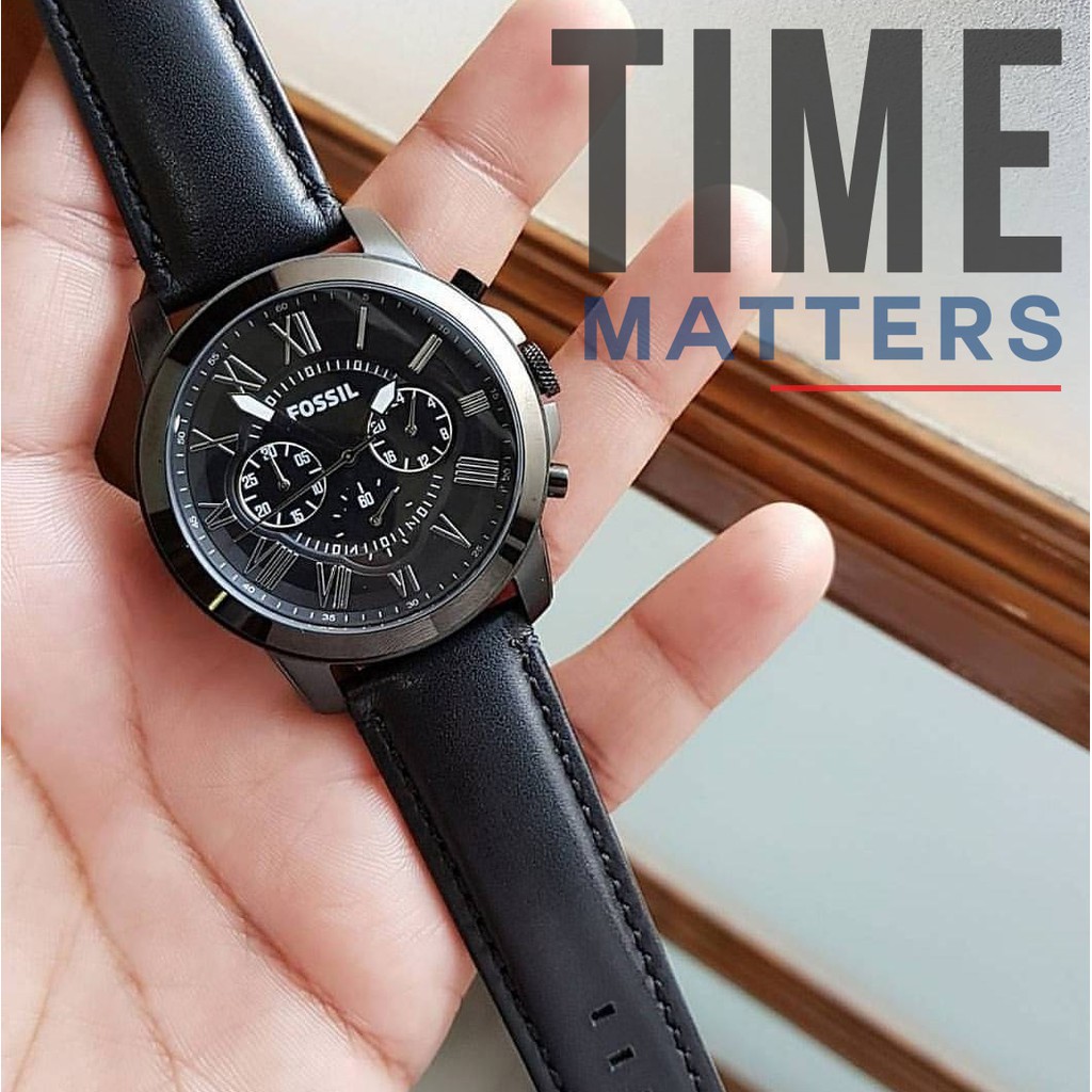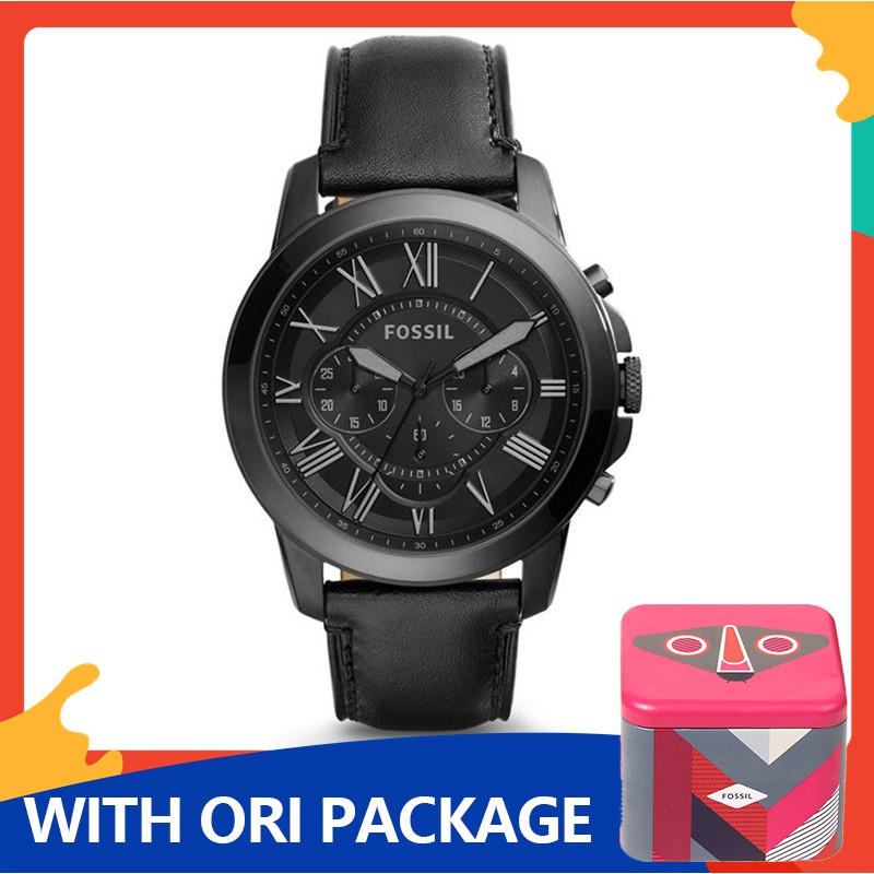 Authentic Fossil Grant Chronograph Black Leather Men Watch Jam